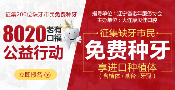 为促进老年群体的牙齿健康,倡导和推广世界卫生组织(WHO)8020计划,即80岁的老人至少应有20颗功能牙,帮助更多的老人解决缺牙的烦恼,享受幸福晚年生活。康贝佳口腔计划在全省发起《8020老有口福公益行动》,旨在恢复老年口腔健康的公益事业,解决老年人缺牙痛苦。现面向社会征集200位缺牙市民,投入专项资金为符合条件的老人免费种植进口牙。 同时,授予种牙市民“社会监督员”的殊荣,对康贝佳种植牙品质进行监督。<<<报名了解活动详情